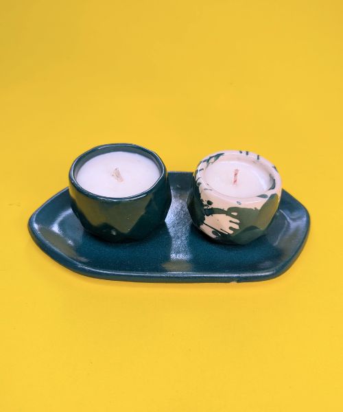Cuando las velas terminan, te quedas con un kit de mezcaleros de cerámica listo para usarse: ideal para mezcal, tequila, sake o lo que quieras brindar. El plato Amelia funciona como joyero o charolita para botanas.